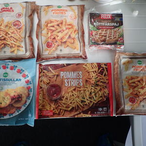 Här finnes flera olika förpackningar med frysta pommes frites samt potatisbullar med