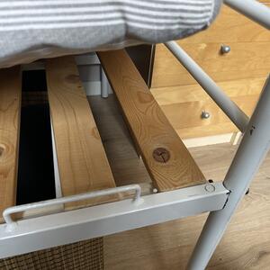 En säng med metallram i vit färg. Sängen har ribbotten i trä och är anpassad för madr