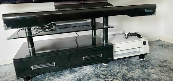 Fint TV bord med två lådor i svart härdat glas
