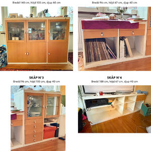 Vi skänker bort 4 matchande vitrinskåp/förvaringsskåp i trä och glas. Alla glasrutor