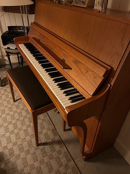 Akustiskt upprätt piano med pianopall trä