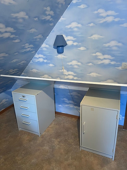 Vitt skrivbord, med lådor och skåp