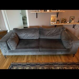 Grå soffa i sammet. Några klösmärken från katt på sidan. Avtagbara överdrag på alla k