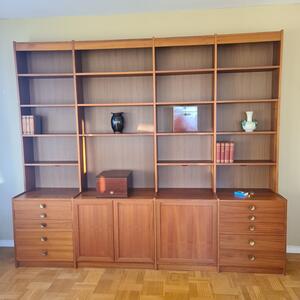 En bokhyllevägg som kan monteras ner i sektioner/delar. Hyllan är gott skick.